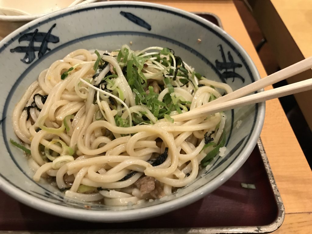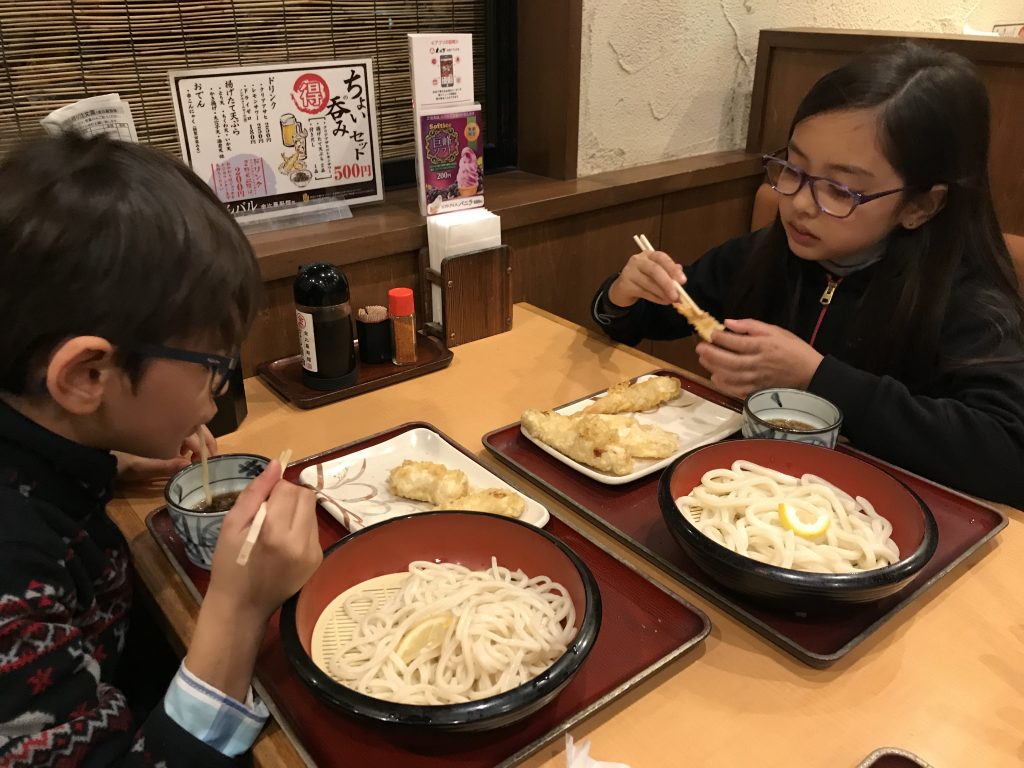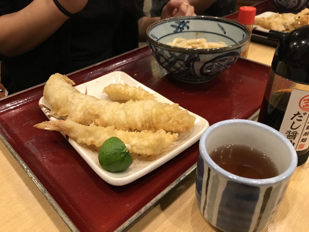 D’abord on a mangé des « udon » ce sont des pâtes de blé, avec des « tempura » des beignets de poisson ou de légumes :
