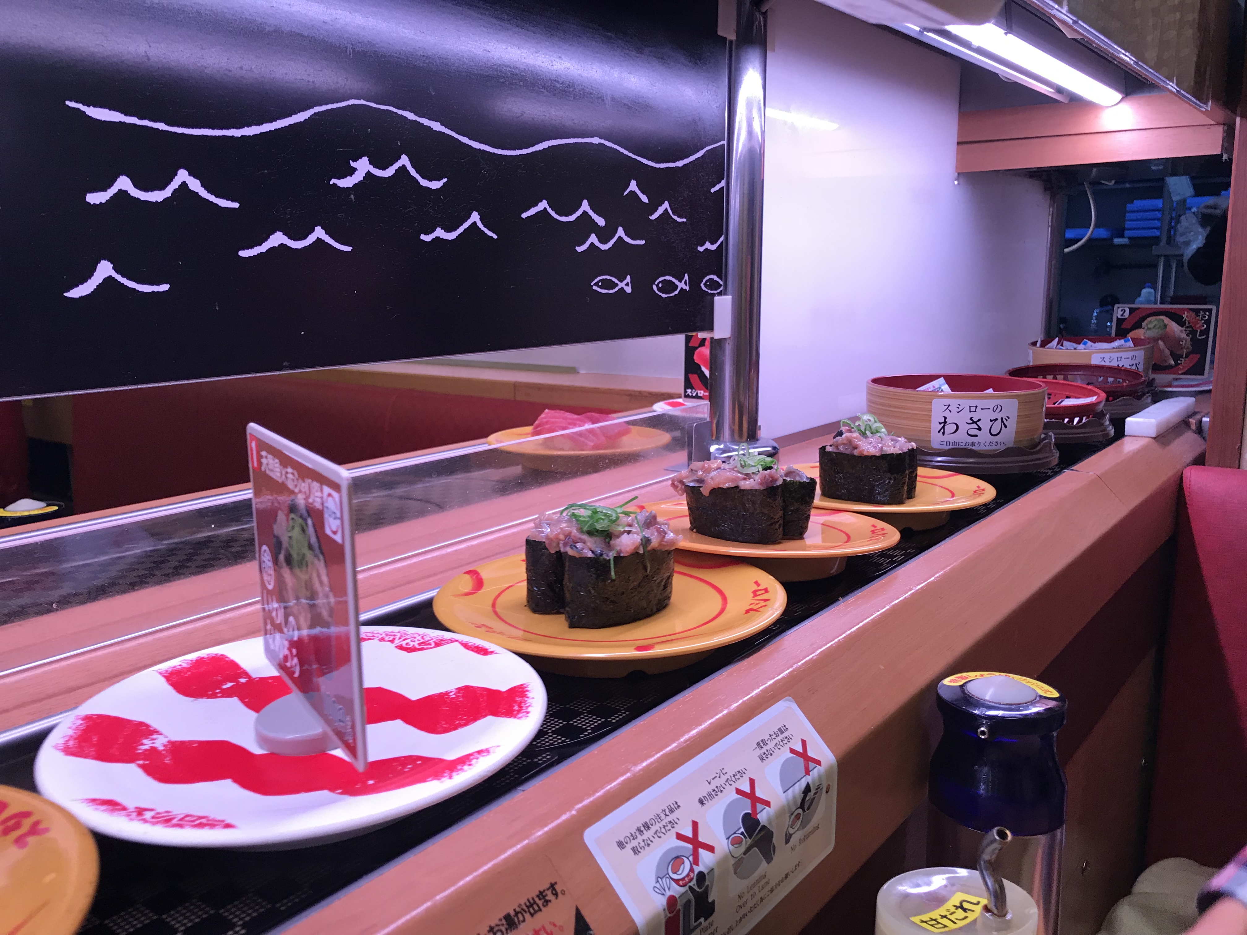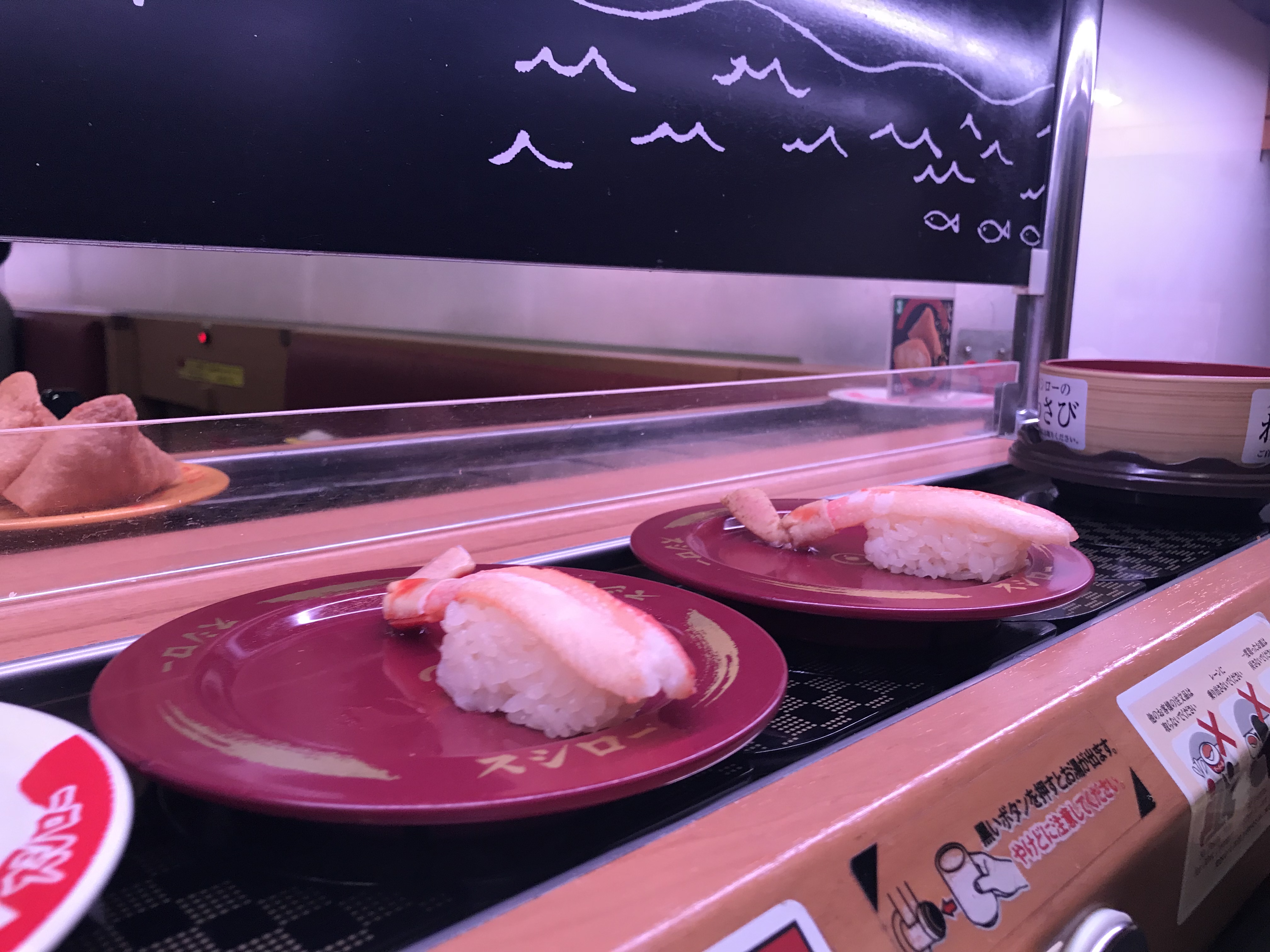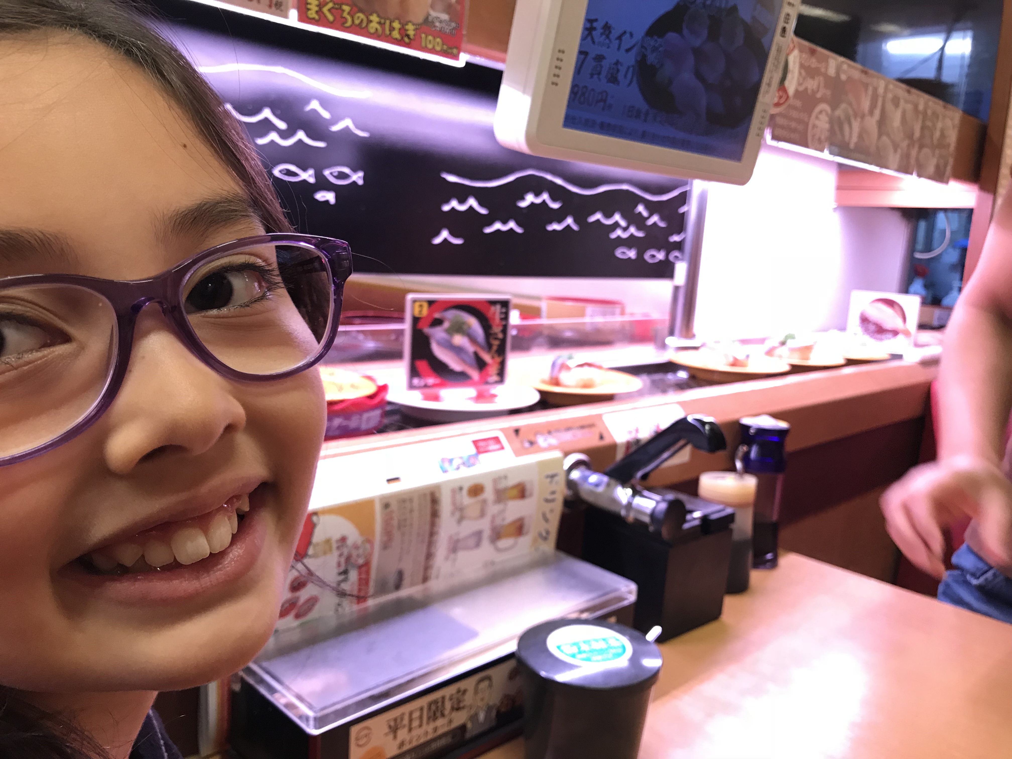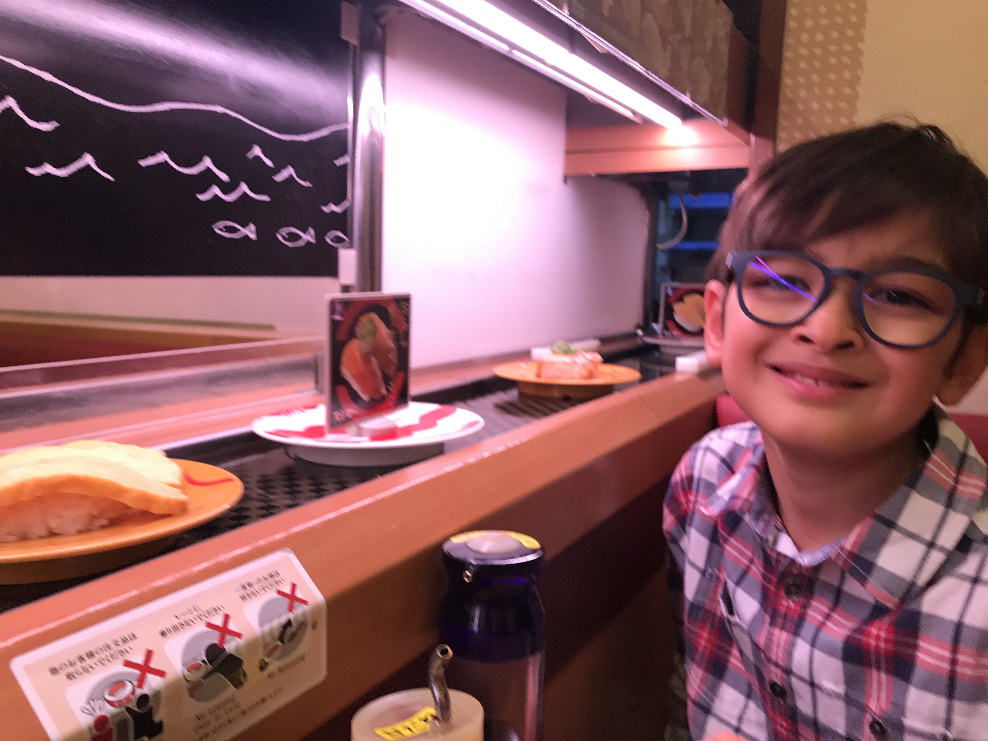 Et puis plus tard on a mangé des sushis avec nos grands-parents au « sushi ro » : on choisit les assiettes qu’on veut sur un tapis roulant :