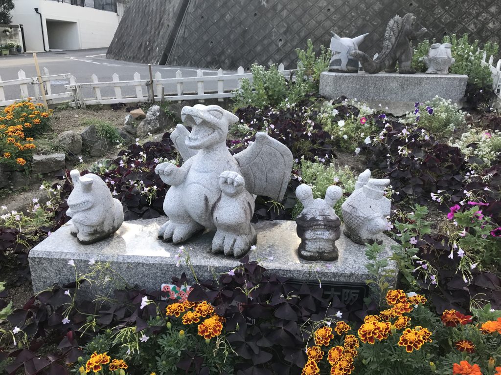 Ici des statues de pokémon dans un jardin public :