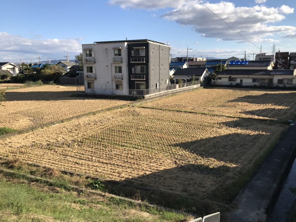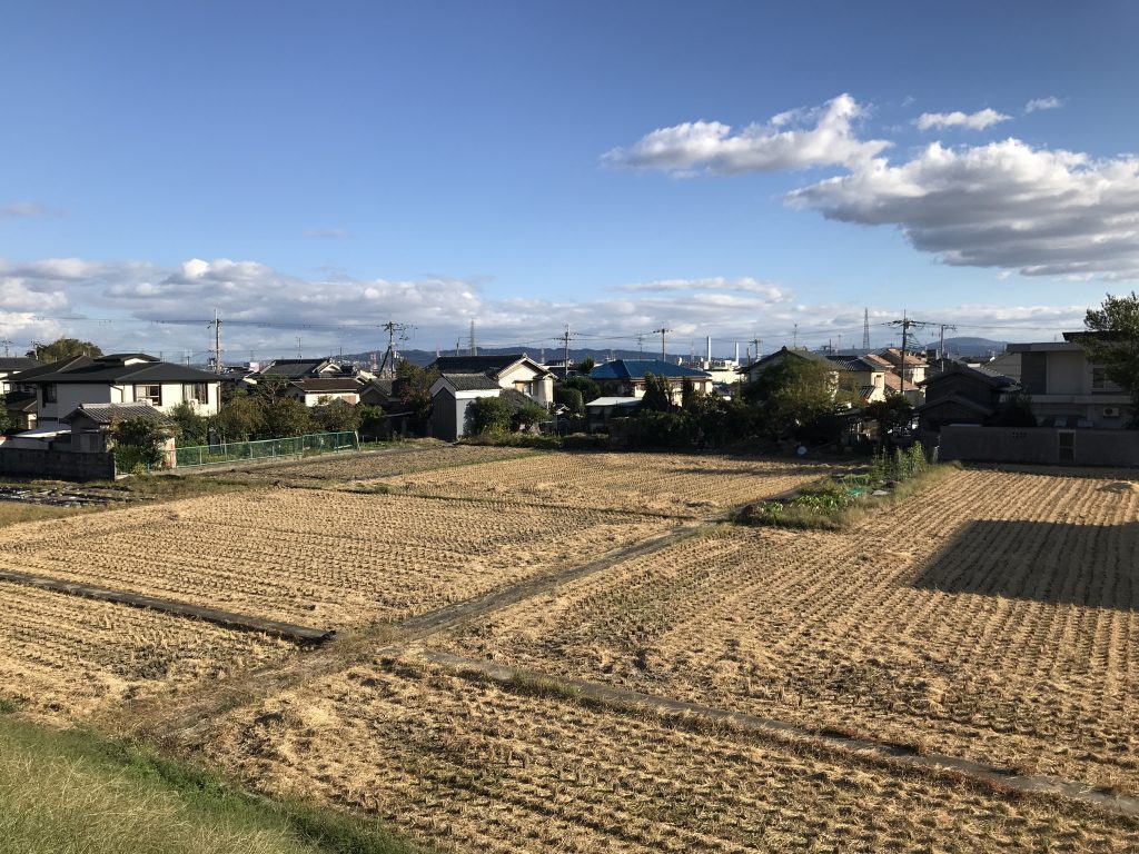 Des champs de riz au milieu de la ville (on voit aussi beaucoup de bâches bleues sur les toits pour couvrir les dégâts du dernier tremblement de terre) :