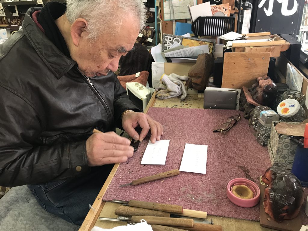 Dans un petit magasin de sculpture, un artiste a gravé nos prénoms sur des petites plaques de bois.