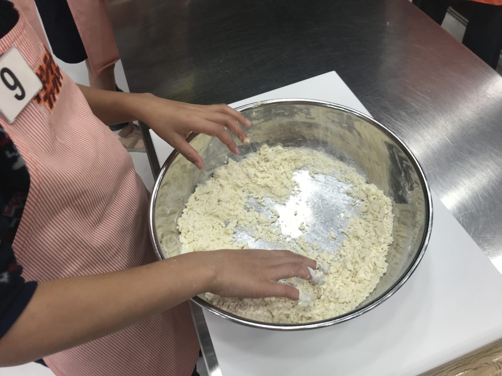 On va commencer par mélanger de la farine à un peu d’eau.