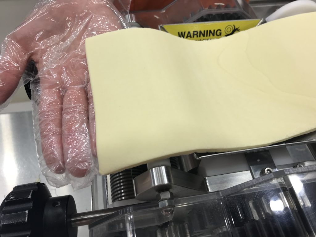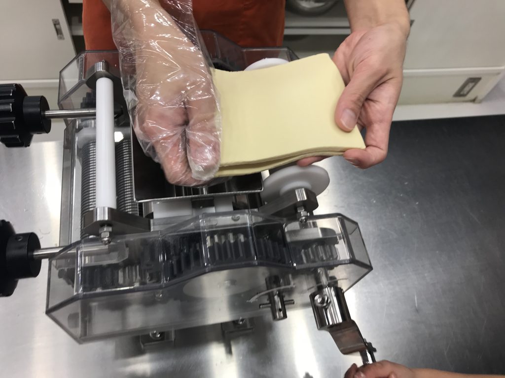 A ce stade, il faut changer de lame pour découper la pâte en fines bandelettes.