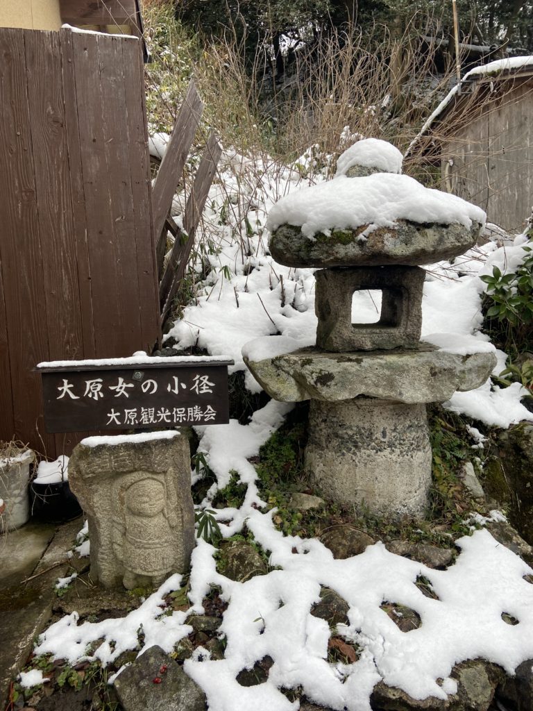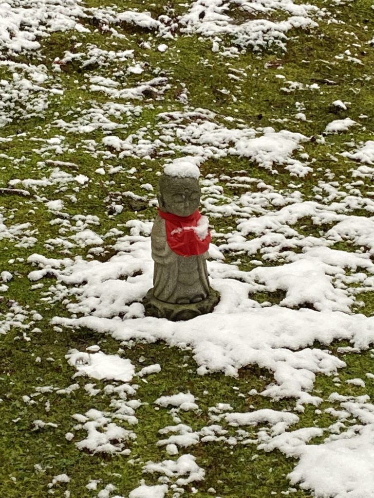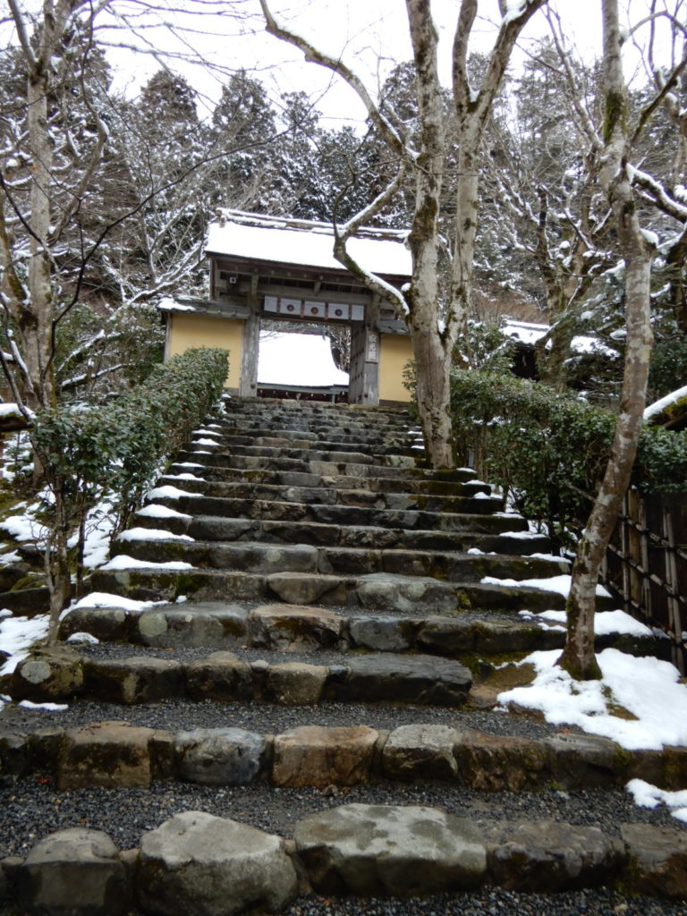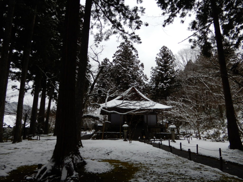 Aujourd’hui jeudi, visite de 2 temples dans la montagne au nord de Kyoto, frissons garantis – à cause du froid bien sûr ! Un temple bouddhiste très ancien (986) : Sanzen-in, puis un autre temple encore plus vieux (594, ce qui correspond à la période d’expansion du bouddhisme au Japon), dédié aux femmes : Jakko-in.