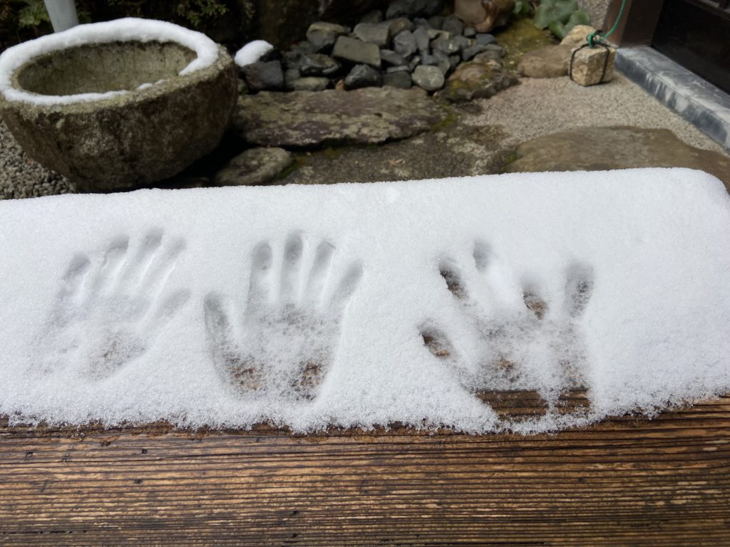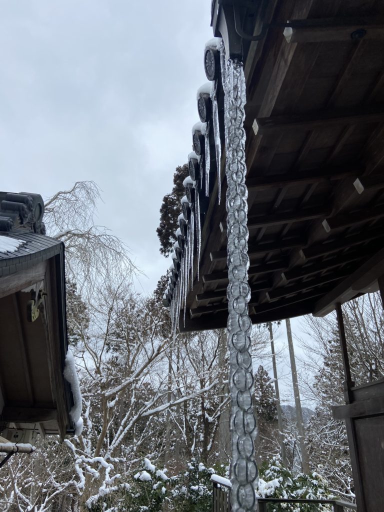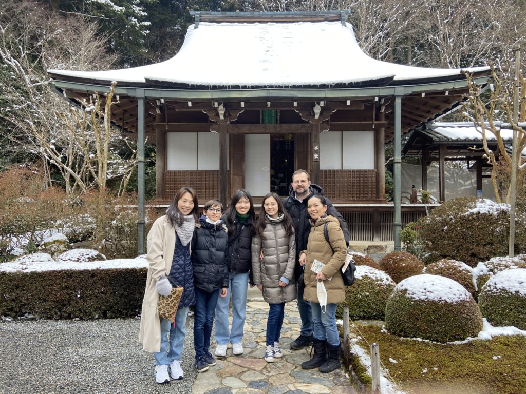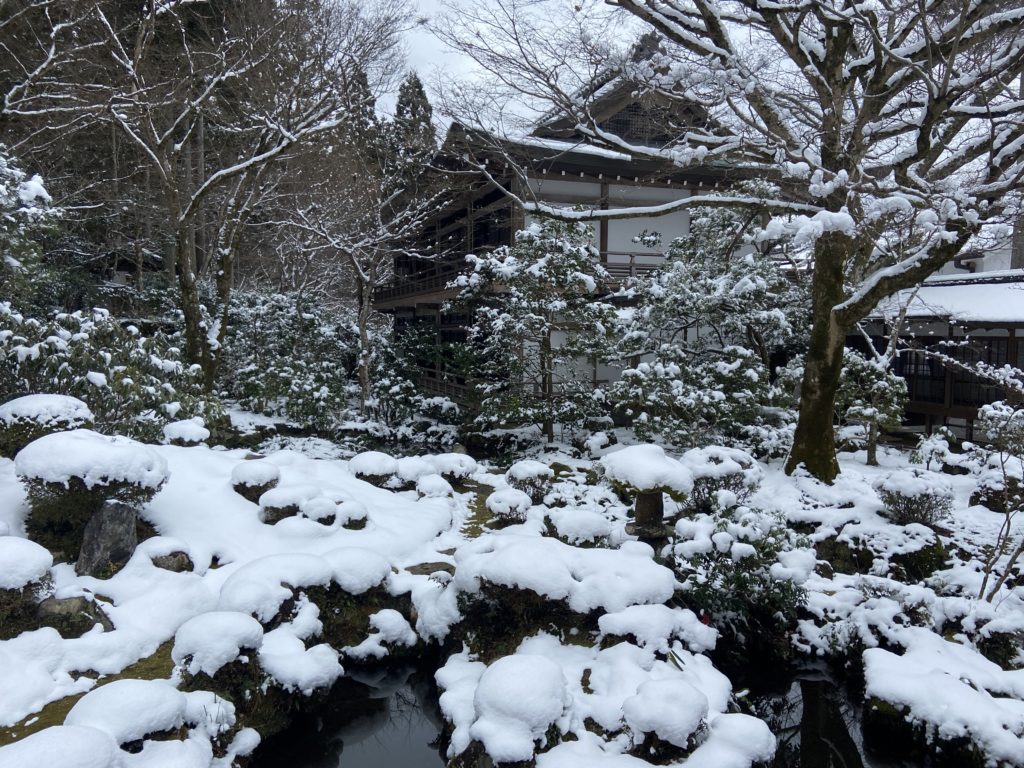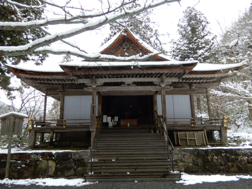 Aujourd’hui jeudi, visite de 2 temples dans la montagne au nord de Kyoto, frissons garantis – à cause du froid bien sûr ! Un temple bouddhiste très ancien (986) : Sanzen-in, puis un autre temple encore plus vieux (594, ce qui correspond à la période d’expansion du bouddhisme au Japon), dédié aux femmes : Jakko-in.