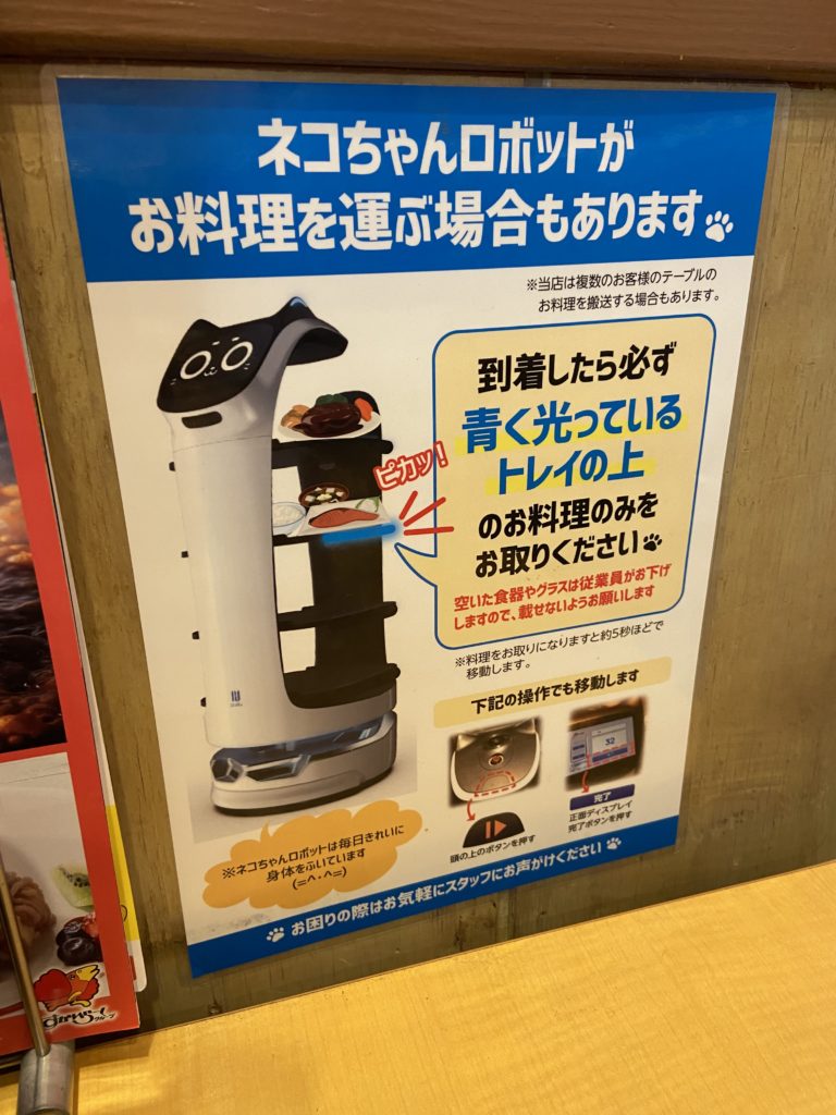Une fois installés à table, on commandes ses plats sur une tablette, et ils arrivent tout seuls quelques minutes après, apportés par le robot-chat, on n’arrête pas le progrès…