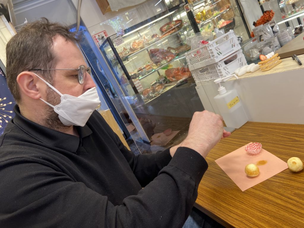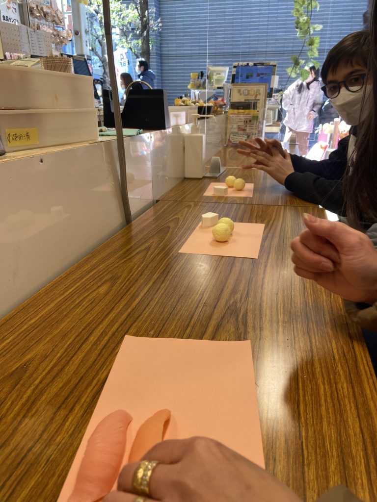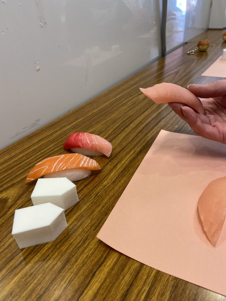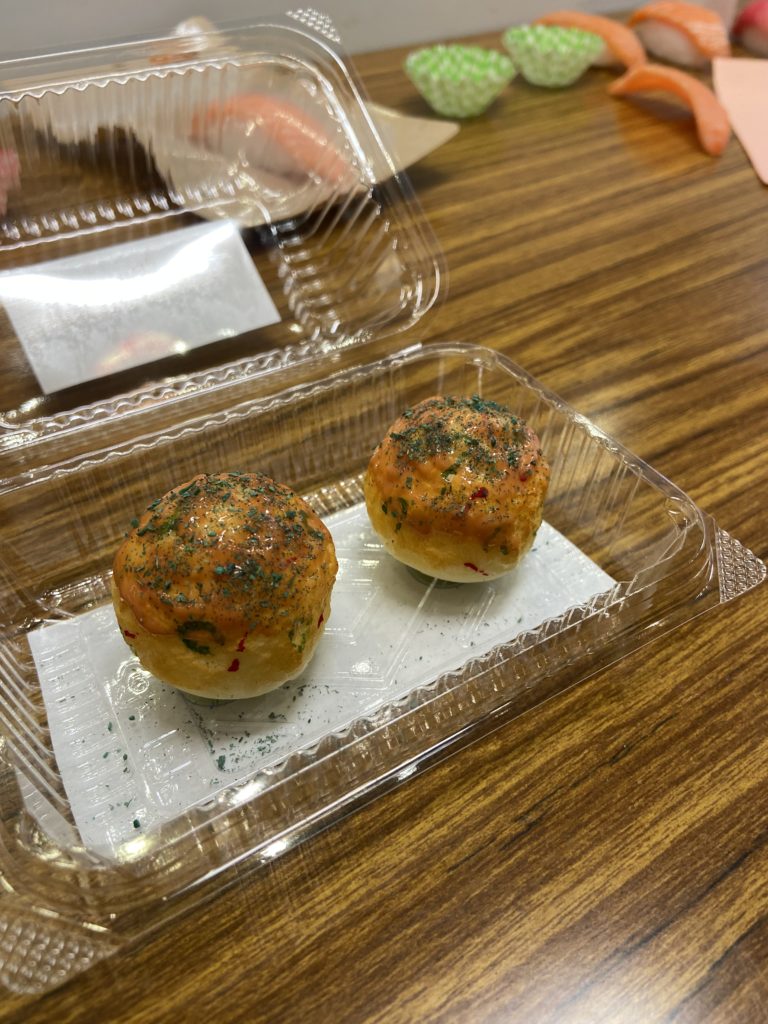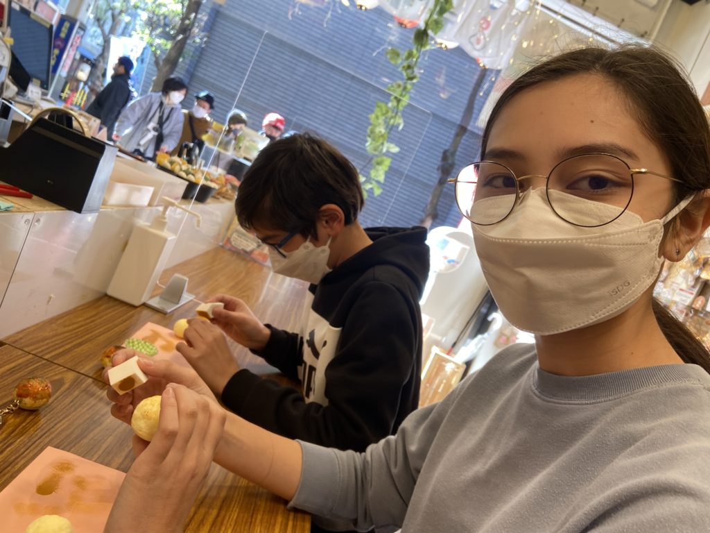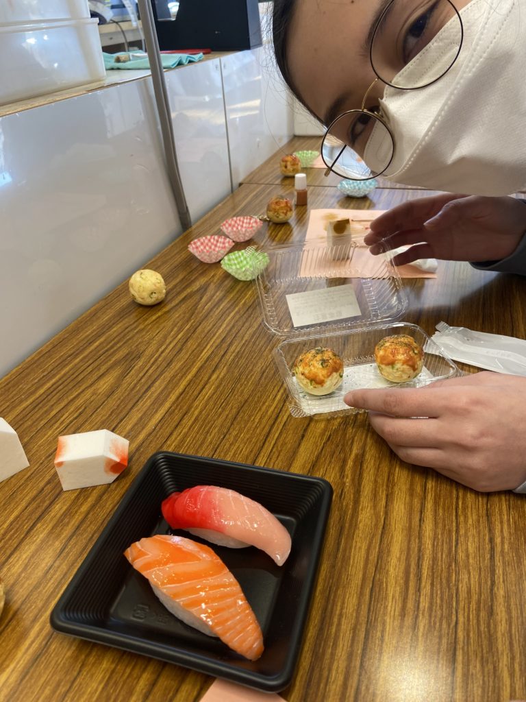 Direction Osaka pour rejoindre un atelier de confection de « Shokuhin sanpuru », de faux plats en plastique disposés sur toutes les devantures des restaurants, exprès pour vous donner faim (et ça marche!). On doit faire des « Tako yaki », des petits beignets de poulpe, et des sushis.
