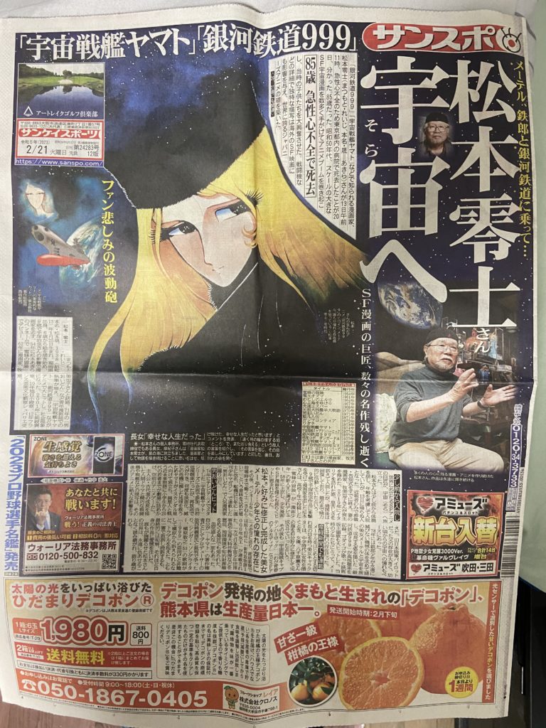 Une petite pensée pour nos amis geeks : aujourd’hui était un jour de quasi-deuil national au Japon suite au décès de Reiji Matsumoto, le père d’Albator, mieux connu ici sous le patronyme de « Capitaine Harlock ». Même à la une des journaux sportifs, il est célébré…