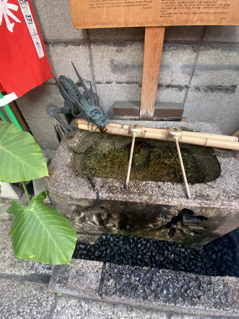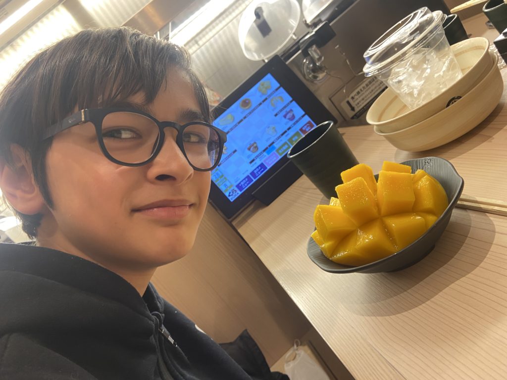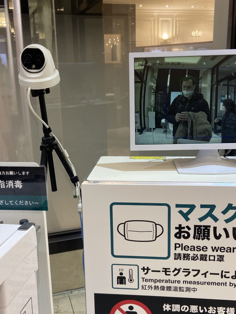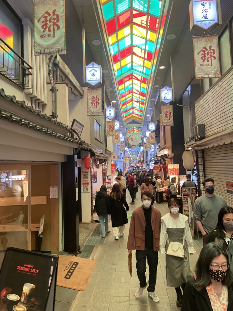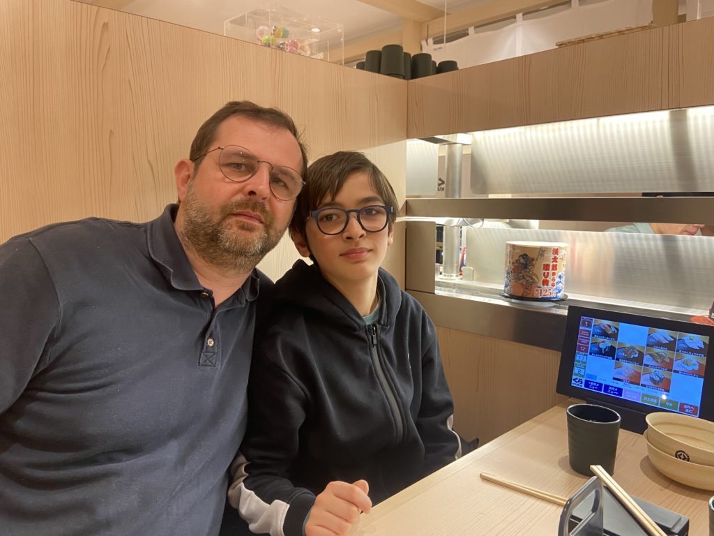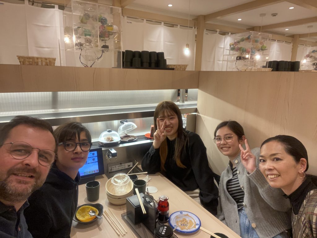 Un passage avec beaucoup de petites échoppesÉvidemment, des poissonneries partout !Des mochis au thé vert…Tirez la langue et faites « Aah » !Partout au Japon on trouve du Daikon, radis blanc très long, mais à Kyoto, et uniquement ici, il existe une variété ronde de ce radis…L’animal préféré d’Edouard…Derrière le petit temple, une arrière-cour très tranquille, c’est ça Kyoto…Apolline maîtrise parfaitement l’art de faire savoir ce qu’elle désire !Mais avant le tapioca, on va aller déguster quelques suchis chez Kura !Pour Édouard, ce sera une mangue en dessertApolline et Hatsune sont comme deux sœurs.Ici, l’ancien côtoie le moderneLe soleil se couche, il va bientôt falloir rentrer pour préparer notre dernière sortie demain…Un magasin de vieux reflex !Dans les magasins, un dispositif détecte les personnes et mesure leur température corporelle. On ne voit pas bien mais là, ma température est de 35.9°. Je suppose qu’au-dessus de 37, la bounding box serait rouge et une petite alarme préviendrait le vigile ?