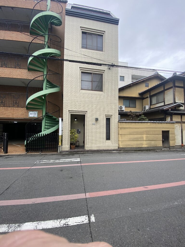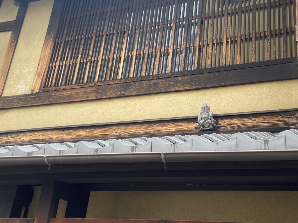 Une ancienne loi publiée à la période Edo (sous le 3e shogunat Tokugawa, vers 1623) taxait la largeur des maisons (tous le 5,04 m). Kyoto – n’ayant pas été détruite pendant la guerre – conserve des stigmates de cet impôt avec des maisons très longues, et une toute petite façade donnant sur la rue. Ce n’est pas le cas de cet imposant monument :