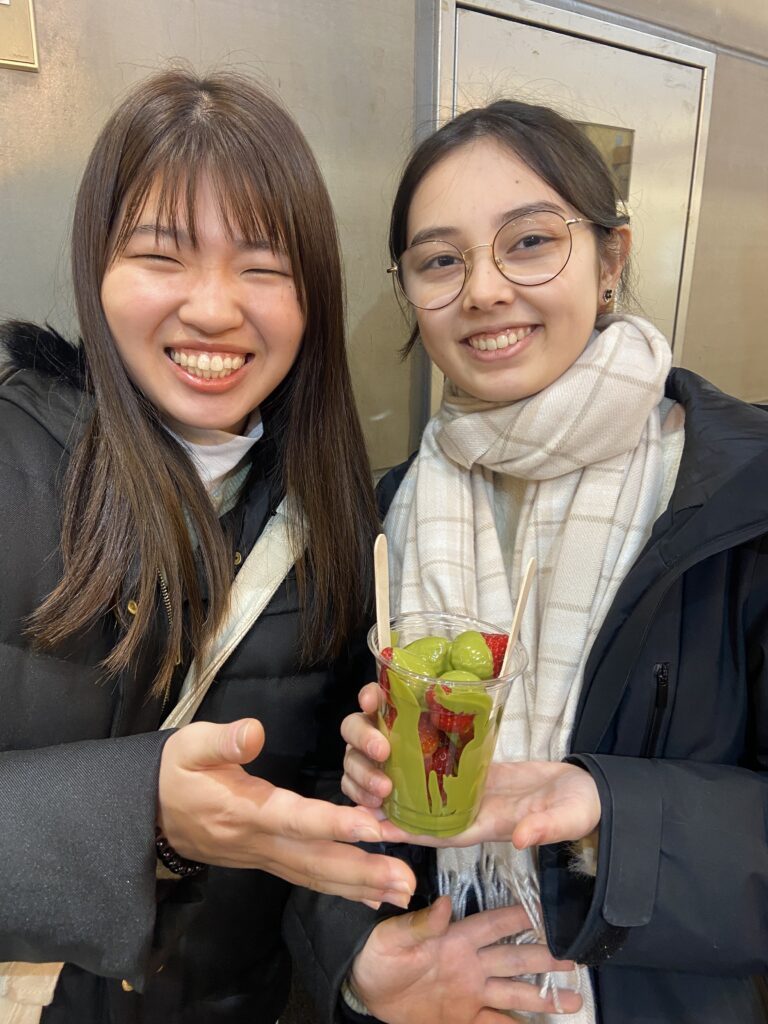 Hatsune et Apolline ont quand même l’opportunité de se procurer un bol de fraises au chocolat ma-tcha, pour la route…