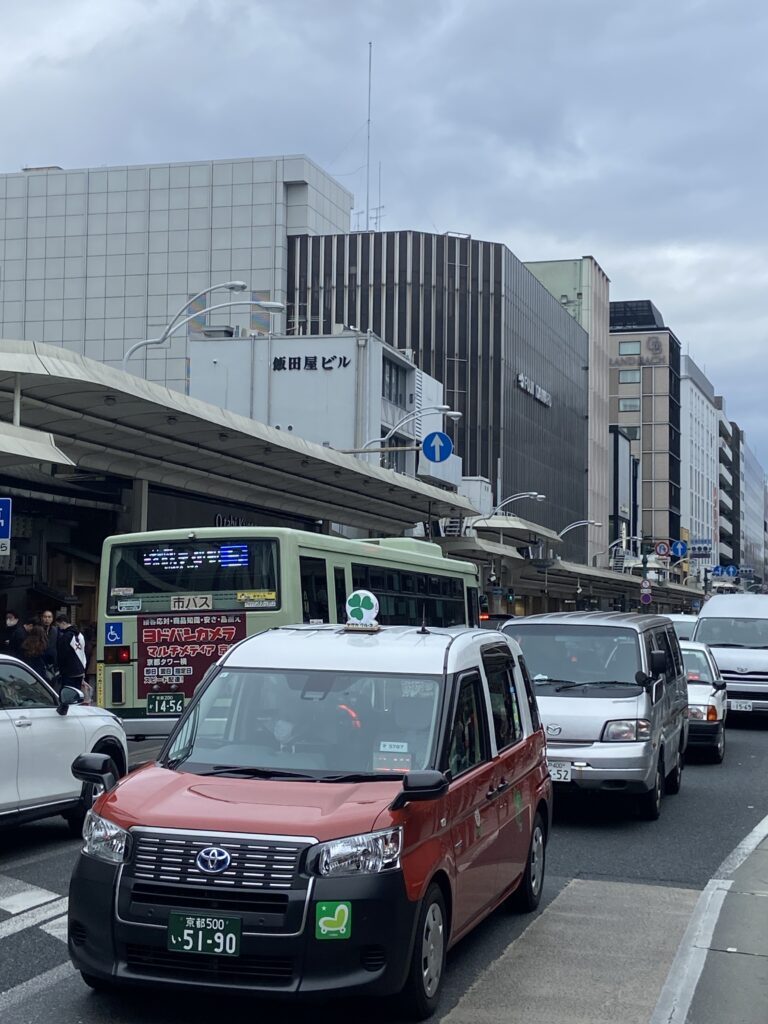 En face, le musée historique de la ville de Kyoto (^)