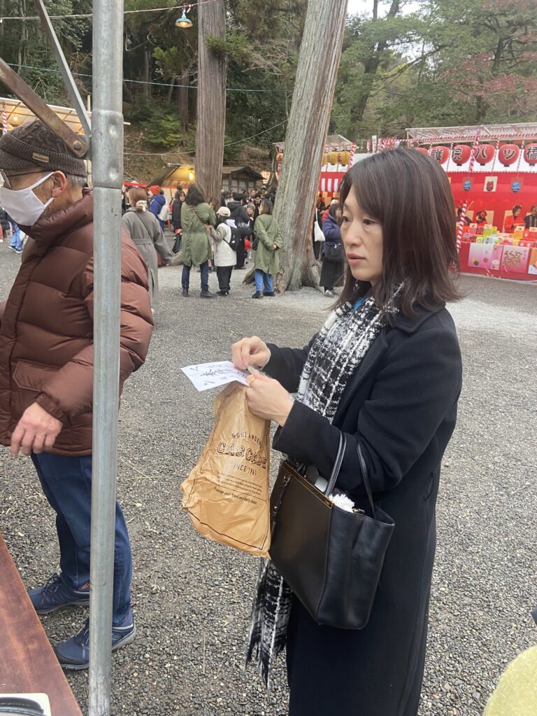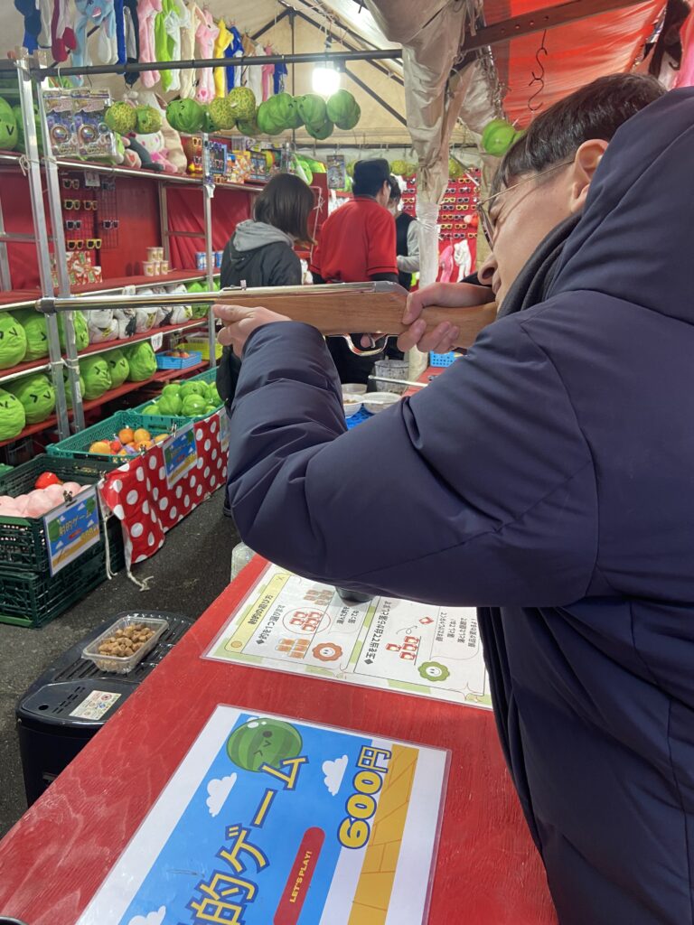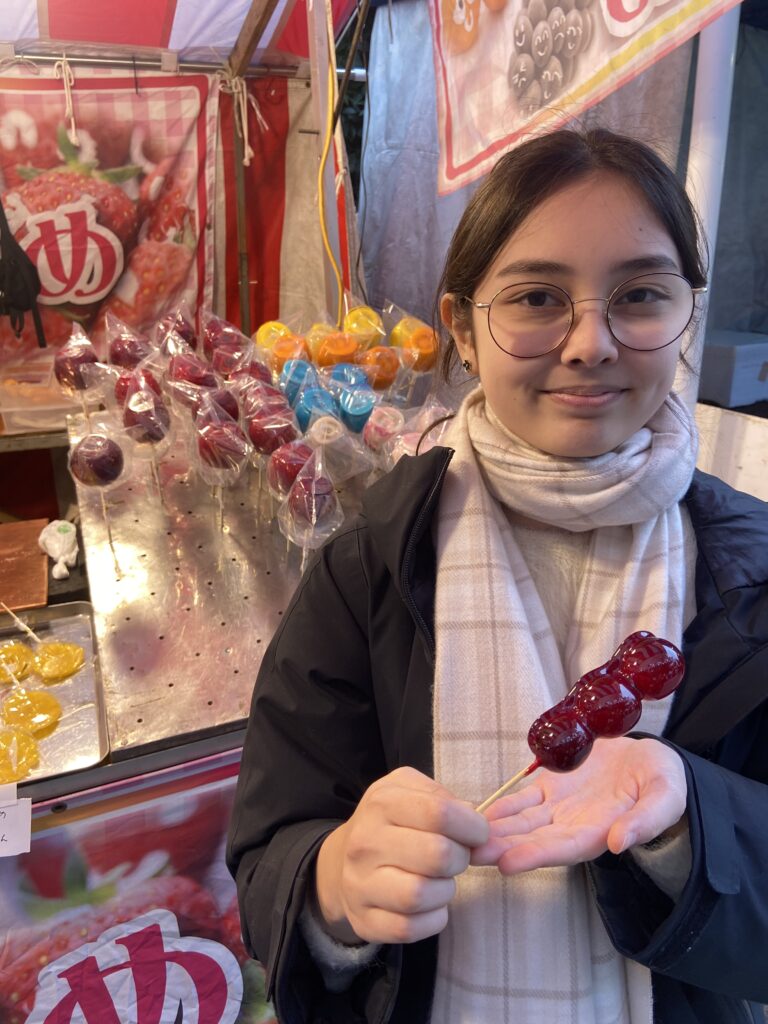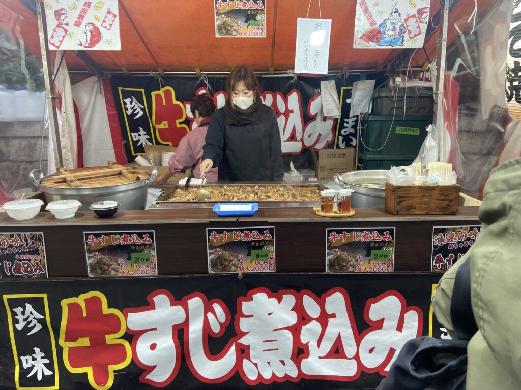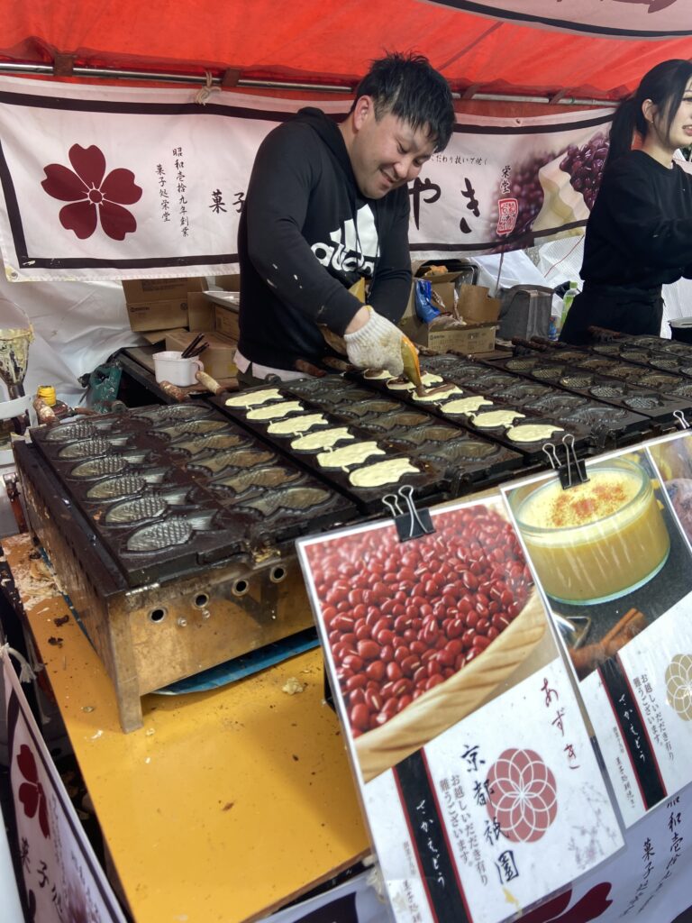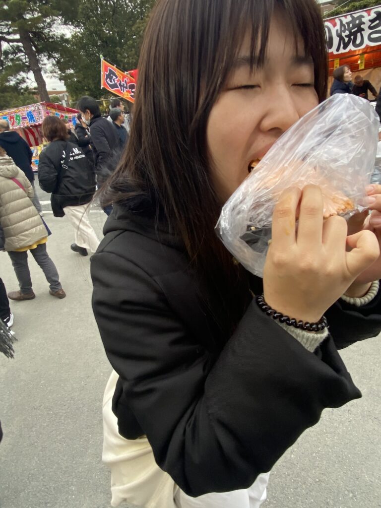 Nous allons nous balader entre les stands du Setsubun-sai : des petites boutiques éphémères montées à l’occasion de cette fête, où l’on peut acheter des friandises ou de petites collations : fraises au chocolat, kara-age, tako-sen…