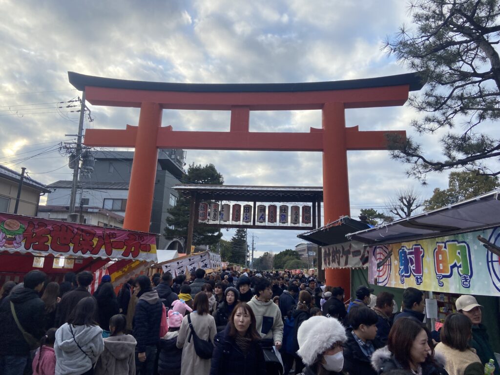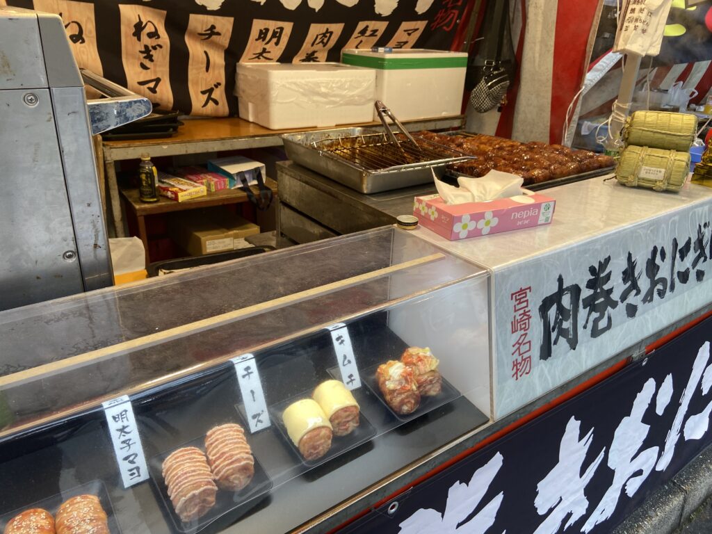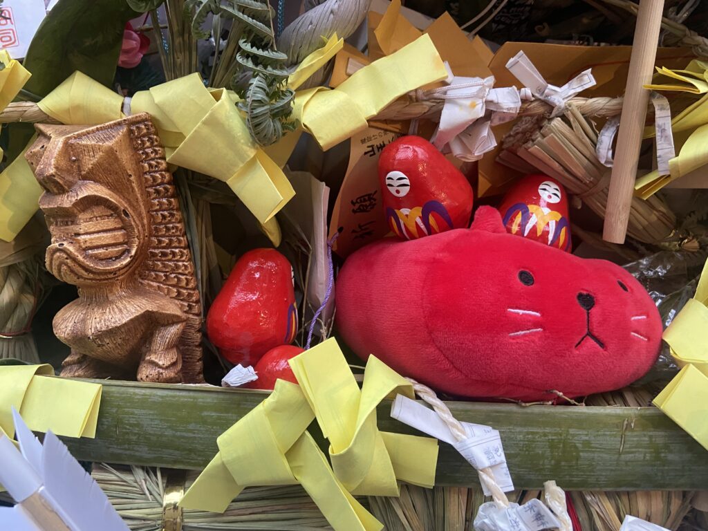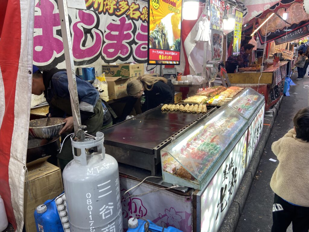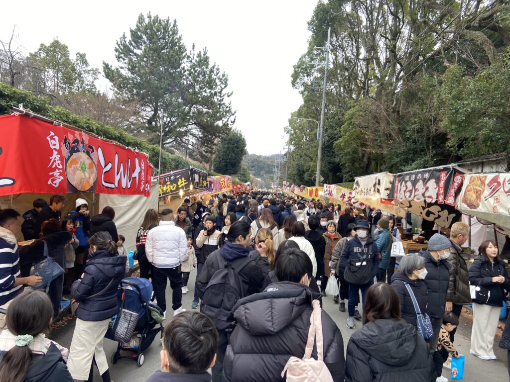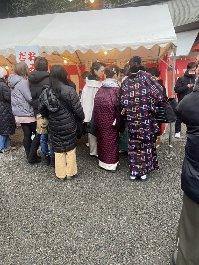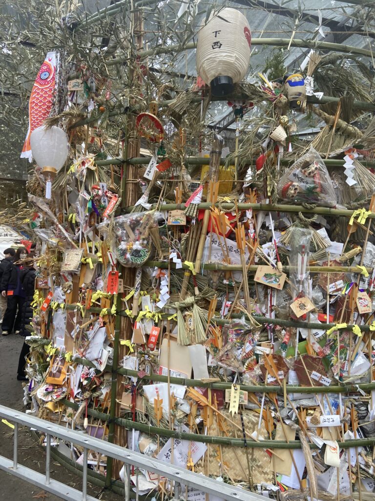 Nous allons nous balader entre les stands du Setsubun-sai : des petites boutiques éphémères montées à l’occasion de cette fête, où l’on peut acheter des friandises ou de petites collations : fraises au chocolat, kara-age, tako-sen…