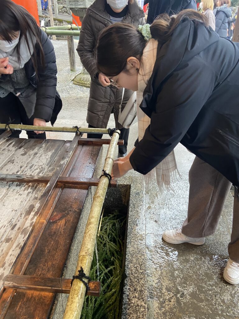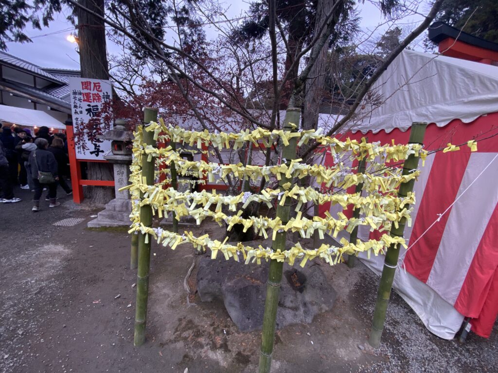 Nous n’échappons pas au traditionnel Omikuji : il faut choisir au hasard une baguette, que l’on échange contre une prédiction. Si elle n’est pas satisfaisante, on peut l’accrocher à un arbre ou sur un portique pour qu’elle soit oubliée :