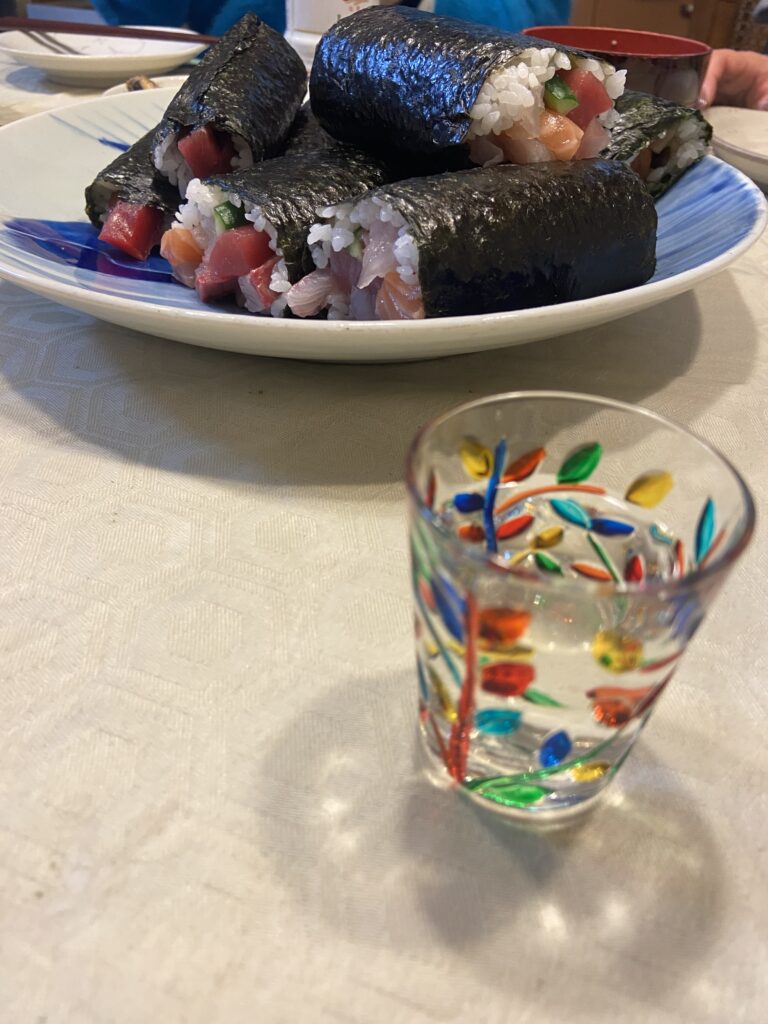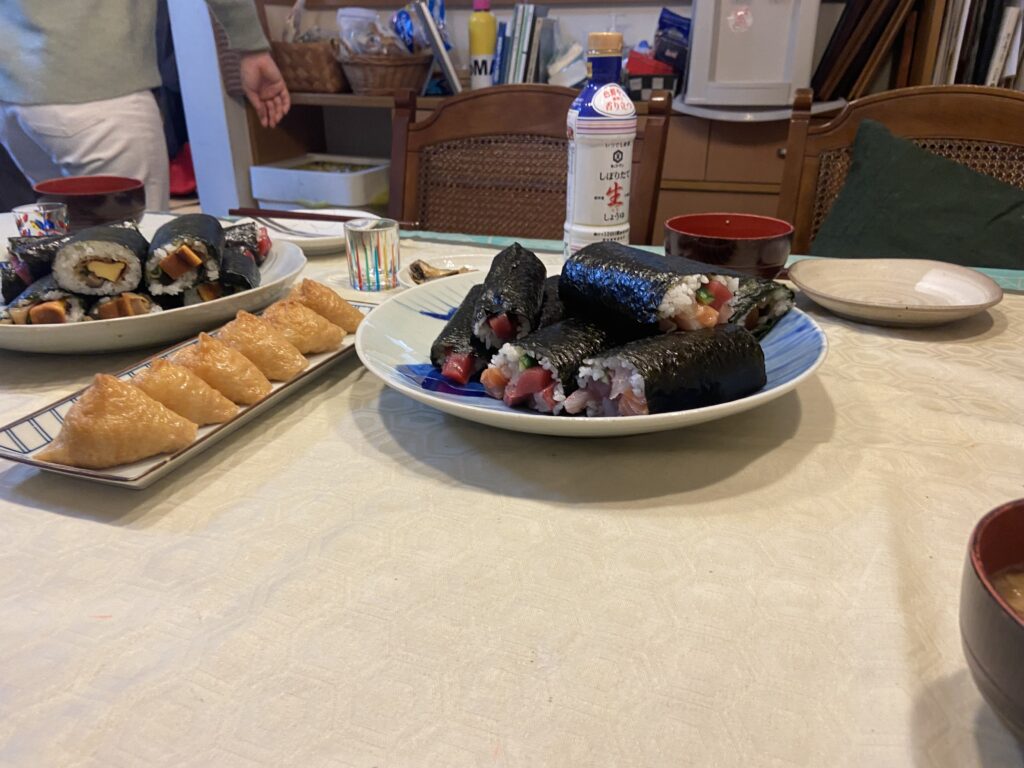 Dernière épreuve pour chassez le démon domestique : le ehoumaki. Il faut manger un makizushi entier, tourné vers un point cardinal bien précis (qui change tous les ans), sans parler ! Selon nos amis, c’est une fête un peu commerciale, mais l’économie japonaise en a-t-elle vraiment besoin pour faire vendre des suchis ? Pas sûr…