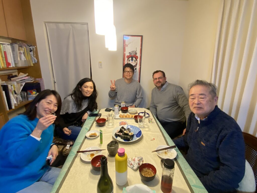 C’est extrêmement rare de s’inviter les uns chez les autres au Japon, aussi apprécions-nous de passer ce moment chez Noriko et Kenji, avec leurs enfants, et le père de Noriko (85 ans !)