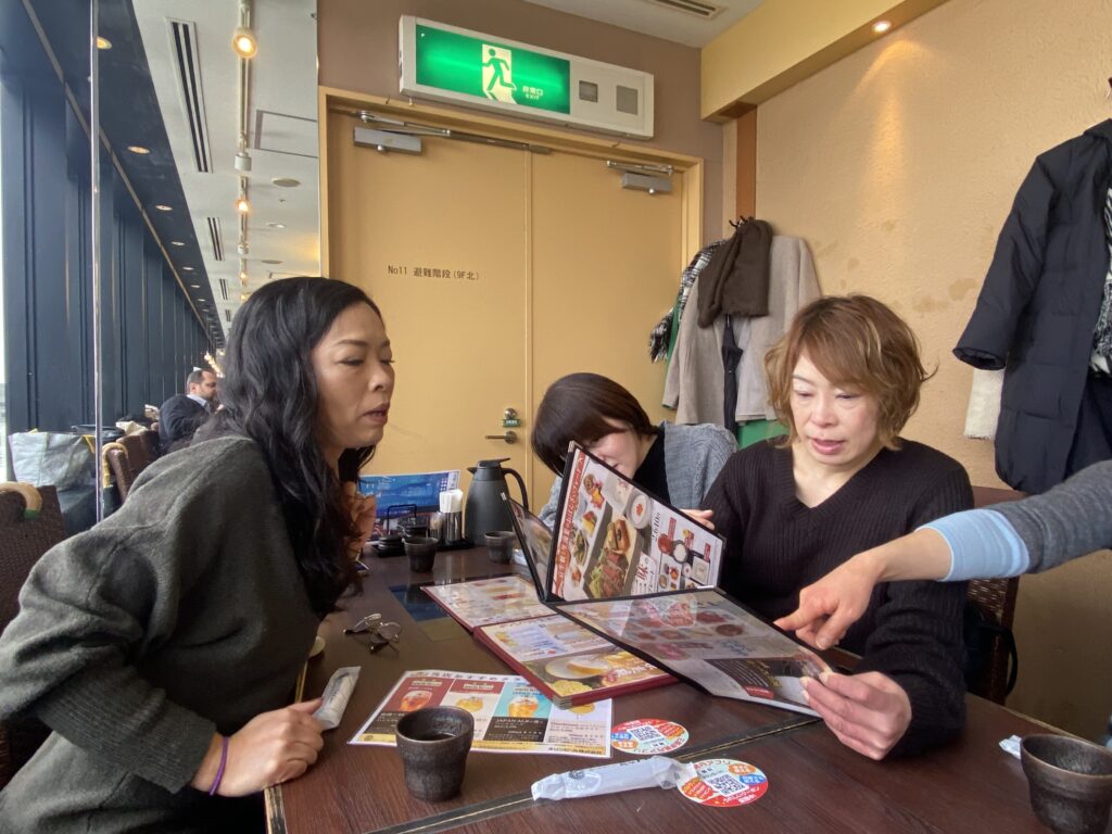 Aujourd’hui, Masami a rendez-vous avec ses anciennes copines de fac. (Alors, imaginez : il y a un peu plus de 20 ans, c’est l’ultime jury qui a validé notre union !) – 6 copines de fac qui se revoient 20 ans après… C’est à la gare de Kyoto que nous avons rendez-vous. Au-dessus de la gare, un grand magasin (type « Galeries Lafayettes ») et au 9e étage des restaurants avec vue sur la ville.