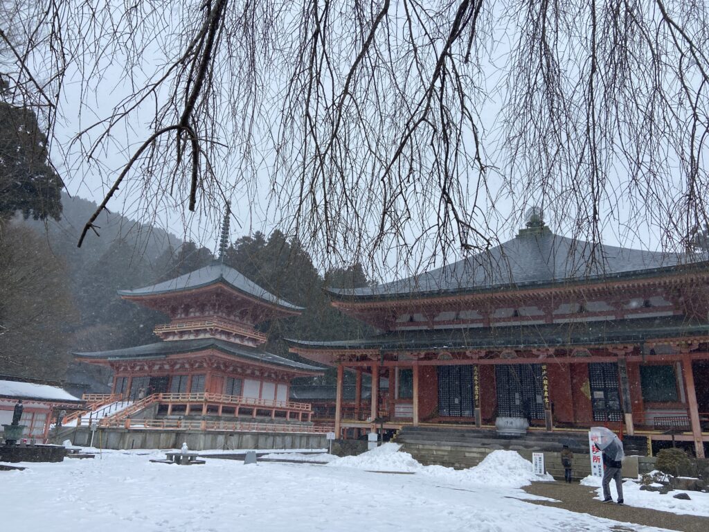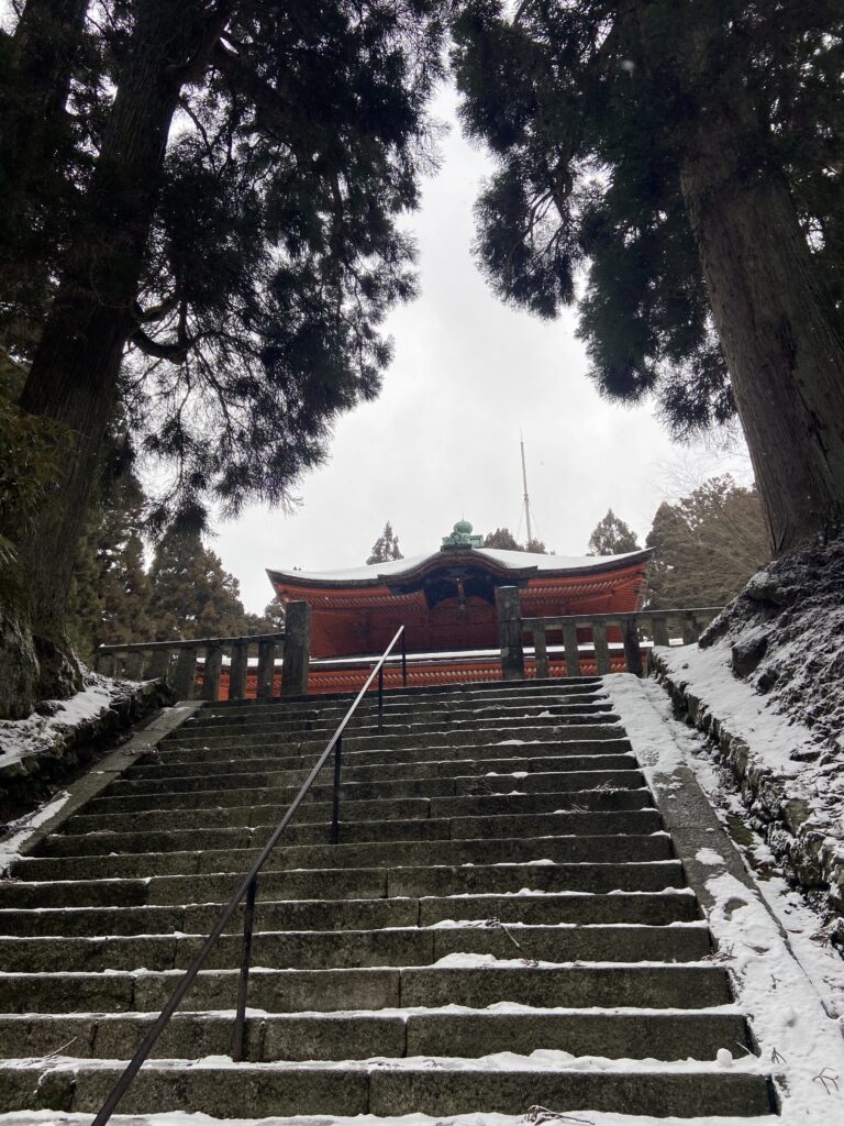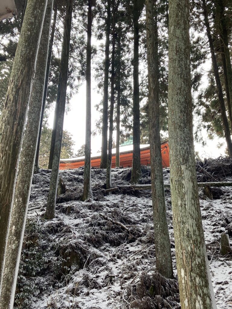 Le temple que nous allons visiter est dans la montagne, pas loin d’Otsu en effet, mais dès que l’on s’éloigne de la ville, ça grimpe. (Nous ne sommes pas très loin du site où nous avions skié il y a deux ans).