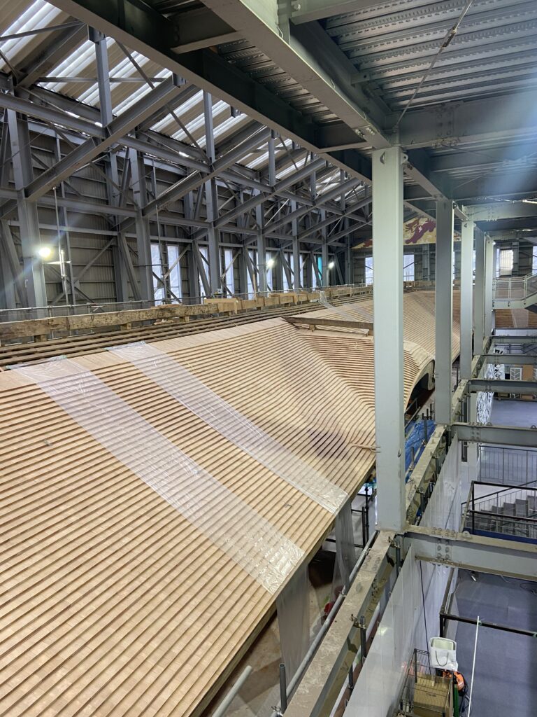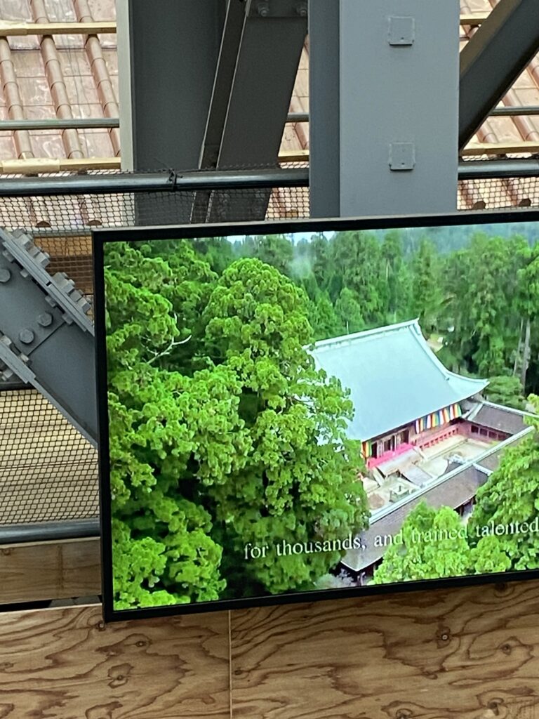 Un peu plus bas, le Konponchudo, centre du temple, en cours de restauration. Un bâtiment de maintenance a été construit autour pour permettre de changer toutes les partie du temple qui sont usées par l’humidité : parties de piliers centenaires, « tuiles » en bois (touchi-buki) fixées par des clous en bambou, jusqu’à la couverture en cuivre…