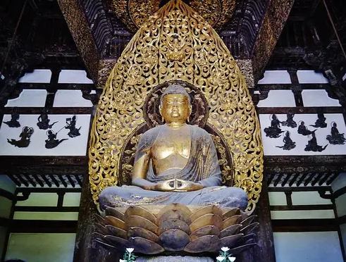 Sur la photo, on ne verra pas la statue en bois de Bouddha, haute de 3 mètres et recouverte de feuilles d’or, entourées par 26 « Bosatsu » ou Bodhisattvas, sortes de divinités qui se déplacent sur un nuage – on pourrait dire comme des anges – chargés d’accueillir les âmes.